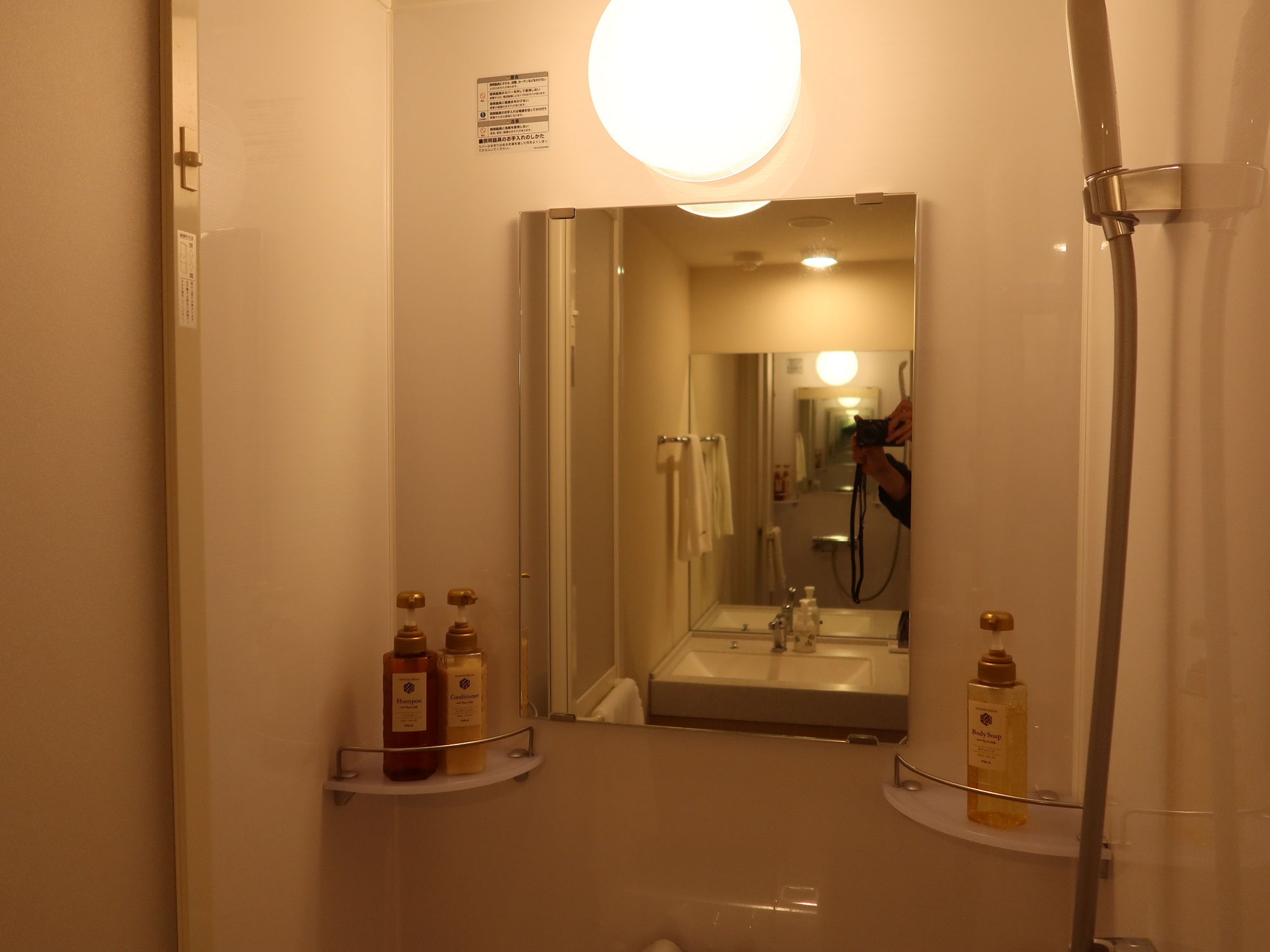 さて、廊下側の2つの扉のうち、引き戸を開けるとその先がシャワールームと洗面台です。これは、ドーミーインお決まりのルールなのですが、部屋にはシャワールームのみで、お風呂が付いていません。なぜかというと、