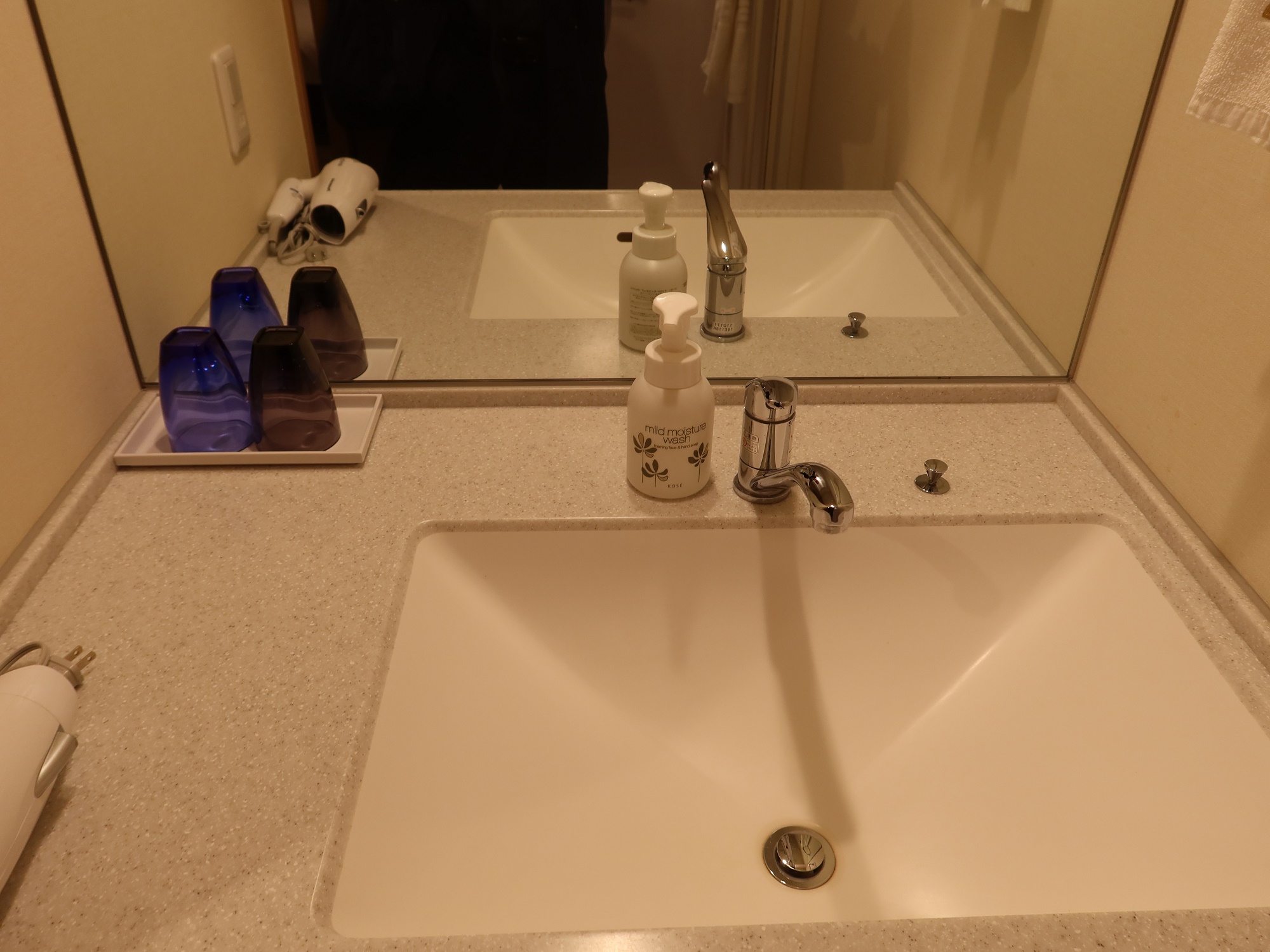 シャワールームの反対側が、洗面台です。広さは十分すぎるぐらいです。ただ、アメニティ類はあんまりないので、必要な方は自分で持っていくか、コンビニで調達しましょう。