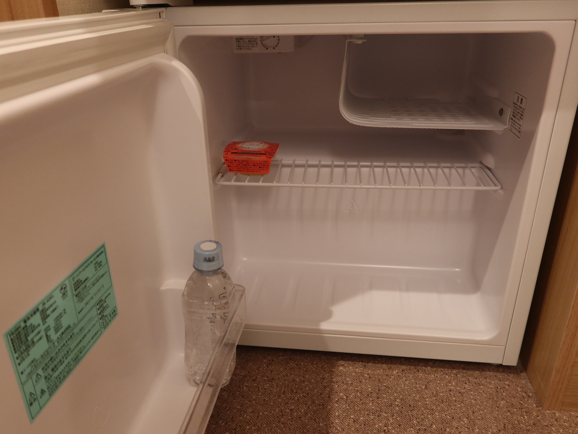 冷蔵庫の中には、ウェルカムドリンクとしてミネラルウォーターと、サービスのお菓子が入っています。ちなみに、この日は青森県産リンゴゼリーでした。冷蔵庫のスイッチは切れないものの、シャワールーム・洗面台に扉が付いていて、更にお部屋に仕切り扉が付いているので、音が気になることはないです。