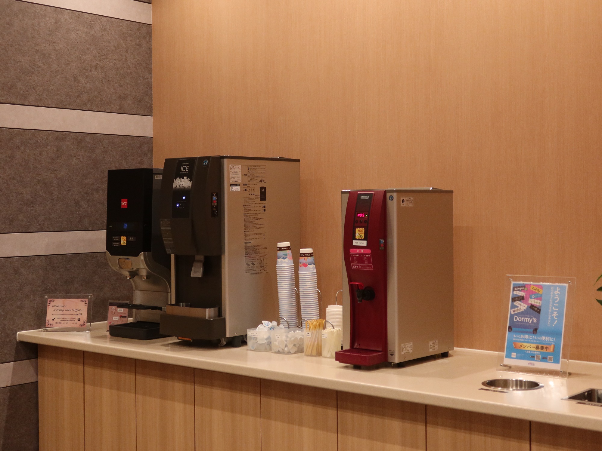 1階にはフロントとフリースペース、お食事処があります。フリースペースでは無線LANが利用可能で、PCを使う方はここで作業をすることもできます。また、ウェルカムドリンクが用意されていて、お部屋に無料でコーヒーを持ち込むことができます。
