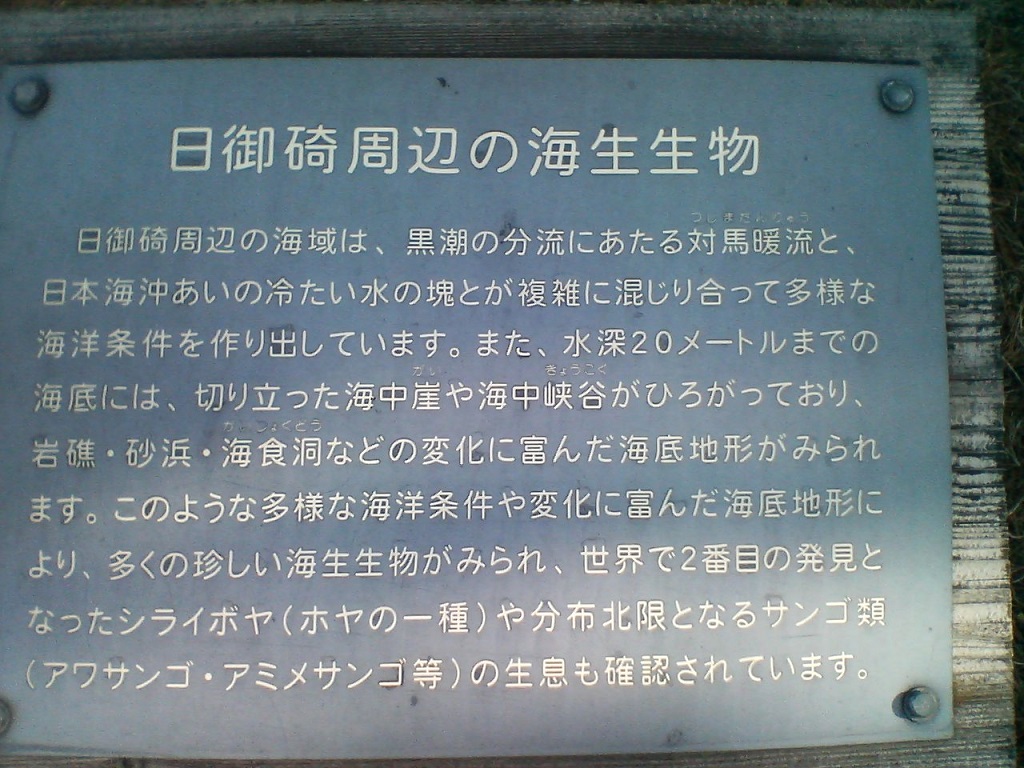 日御碕付近の海域は、対馬海流と日本海沖合の冷たい水が複雑に混ざり合うらしく、多くの珍しい海生生物がみられるそうです。例えば、世界で2番目の発見になったシライホヤ(ホヤの一種)や、分布北限となるサンゴ類(アワサンゴ・アミメサンゴ等)の生息も確認されているそうです。