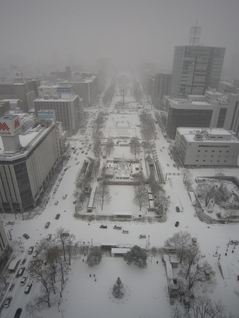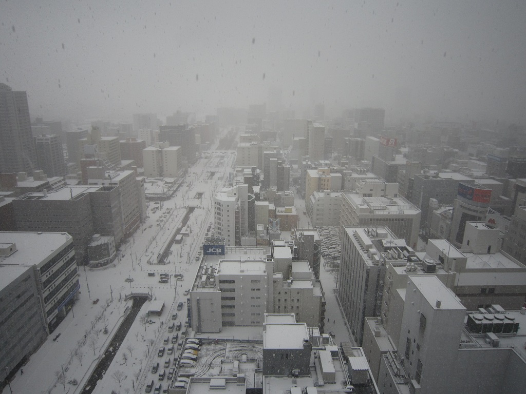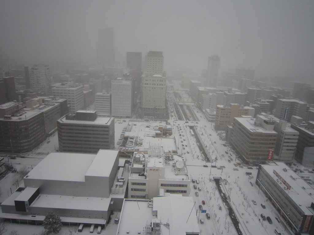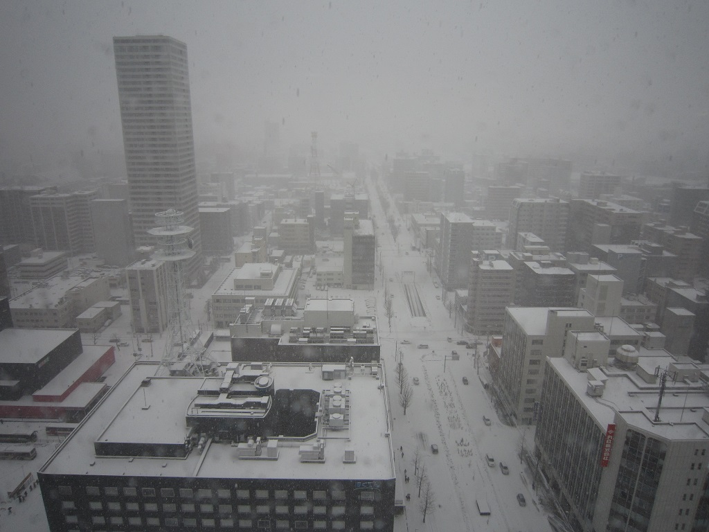 今日の札幌は雪なので、展望台からの景色も雪景色です。これが、北側です。晴れていれば、この先にJR札幌駅が見えます。