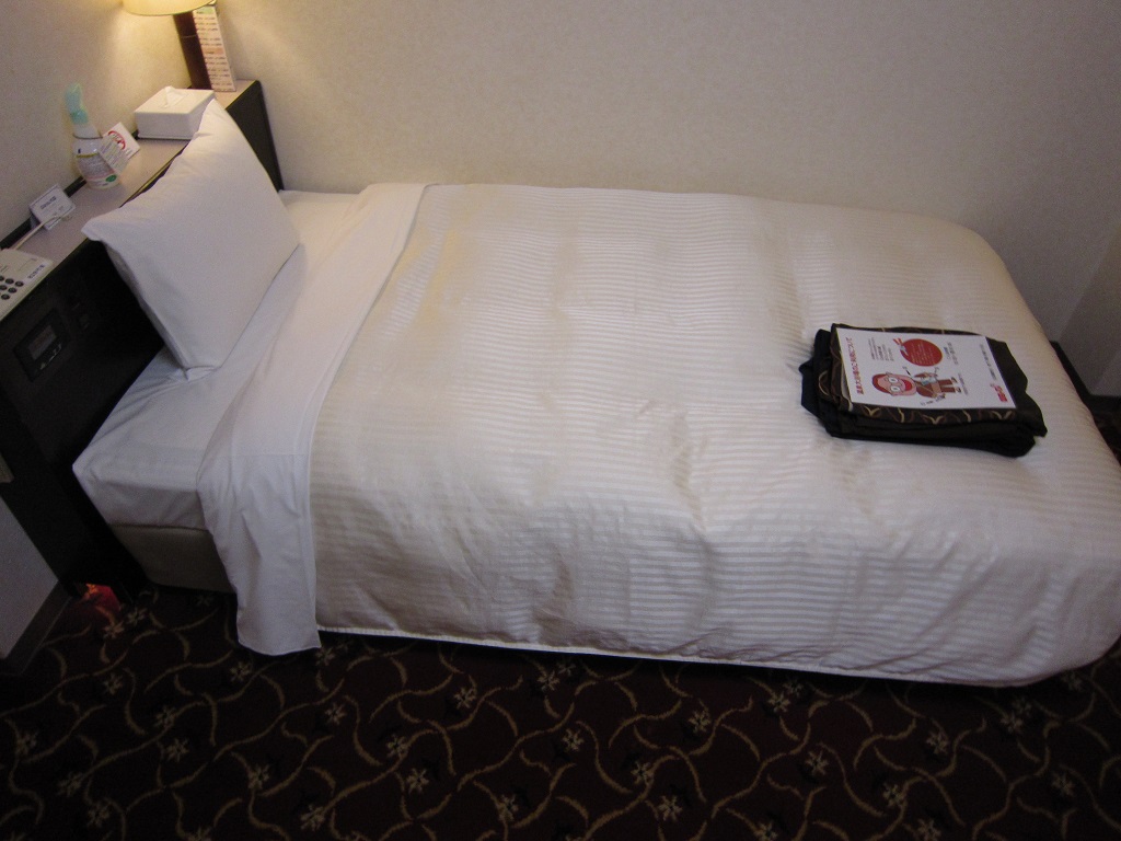 ベッドは十分広くて快適です。館内着は作務衣で、この格好のままで大浴場や館内を歩いてもいいそうです。大浴場があるホテルが増えてきた結果、館内を浴衣や部屋着で歩いてはいけないというルールが段々なくなりつつあります。
