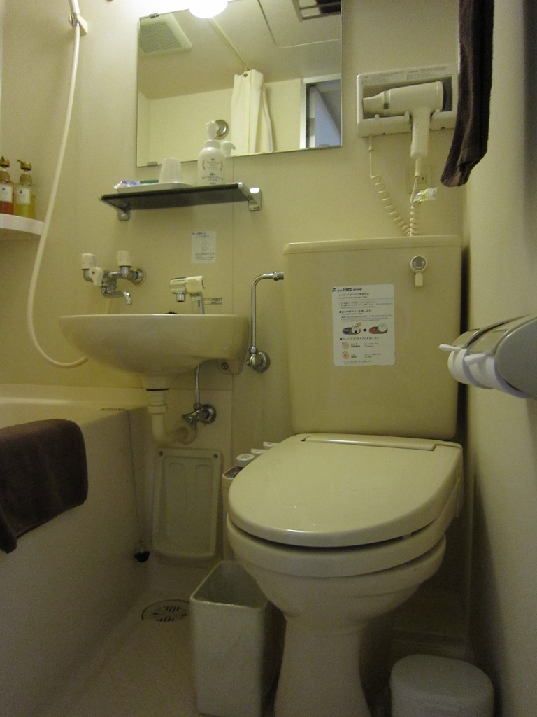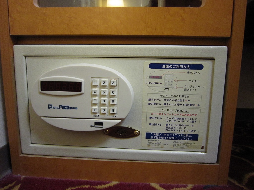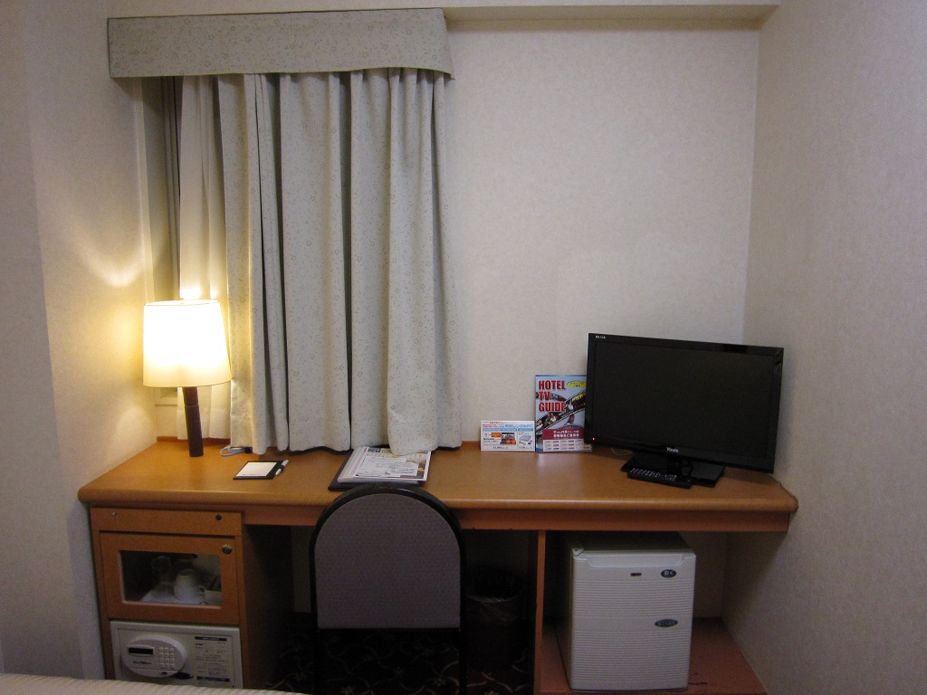 デスクにはインターネット接続の他、電気ポットとお茶セット、テレビ、冷蔵庫があります。特筆すべきは、部屋に金庫が置いてある点。クレジットカードやキャッシュカードがそのまま鍵になる仕組みだそうです。また、各部屋にズボンプレッサーがあります。ただし、キューティー吉本的には、ズボンプレッサーは要らないから、代わりに加湿空気清浄器を各部屋に置いて欲しいですね。