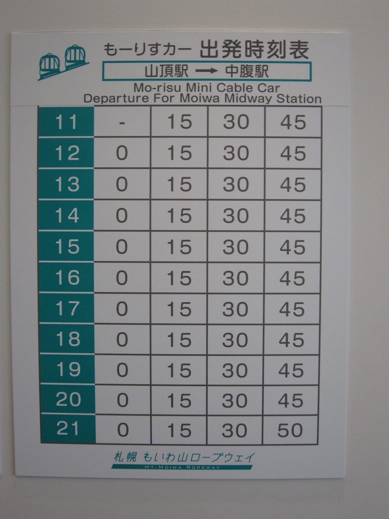 もいわ山頂駅のもーりすカーの出発時刻表です。15分刻みで、すごくわかりやすいダイヤです。もいわ山ケーブルカー同様、出発直前に放送が流れると、改札が始まります。それまでは、しばらく待ちます。