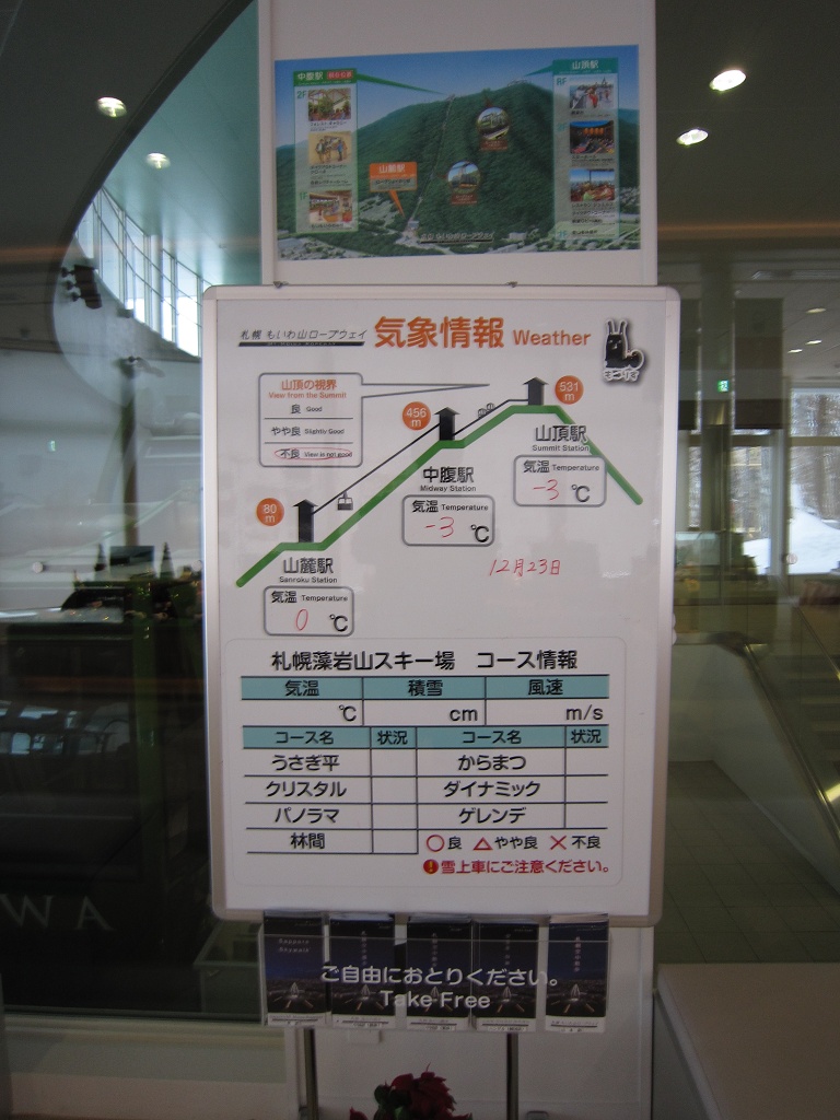 その謎を解くカギがこれ。気象情報ボードです。ここには積雪量も書くようになっていまして、今じゃたっぷり雪が降っているので真面目に書いてないですけど・・・て、これがあるってことは、スキー客は中腹駅で降りるってかぁ!?