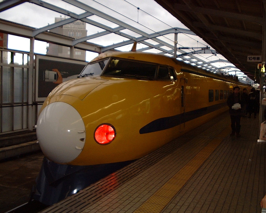 残念ながら、開業したときの0系の写真は見つかりませんでした。その代わりと言っては何ですが、0系とまったくおんなじ形で、黄色い新幹線の写真が見つかりました。ドクターイエローと言って、計測用の列車ですね。(むしろこっちの方が珍しいって言う説も…)