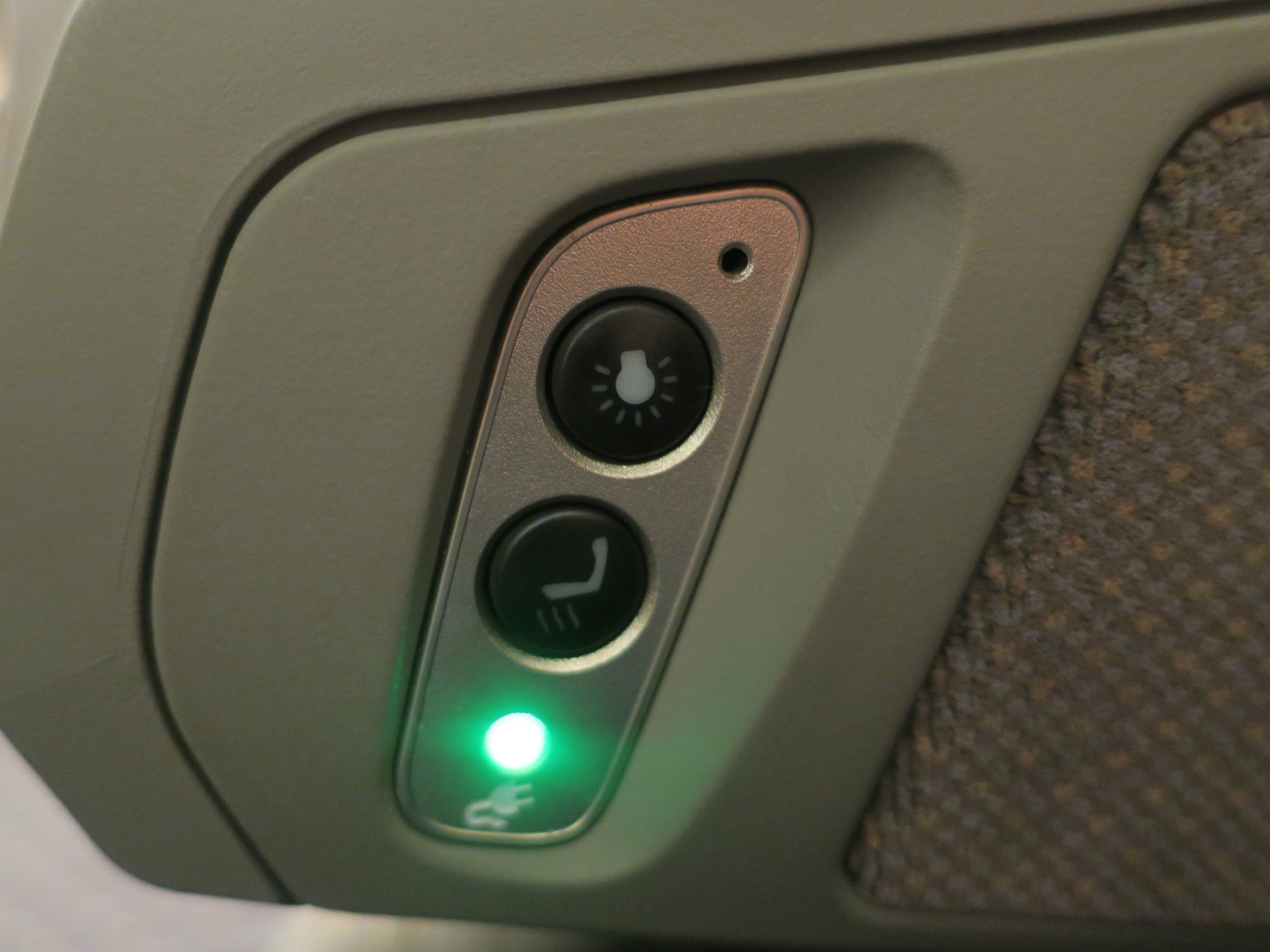 真ん中の肘掛には、読書灯とシートヒーターのスイッチが付いています。また、ACコンセントが使用可能な時、緑色のLEDが点灯します。