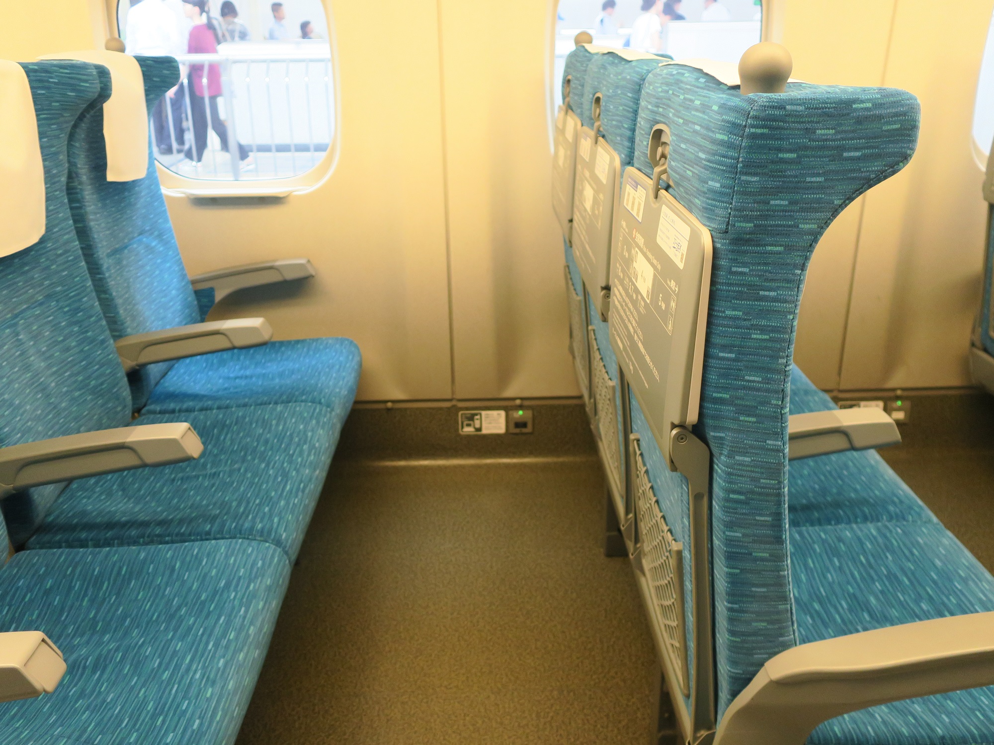 普通車指定席および自由席です。山側、つまり富士山が見える側は2列シートです。D列が通路側、E列が窓側です。窓の下にはACコンセントがあります。