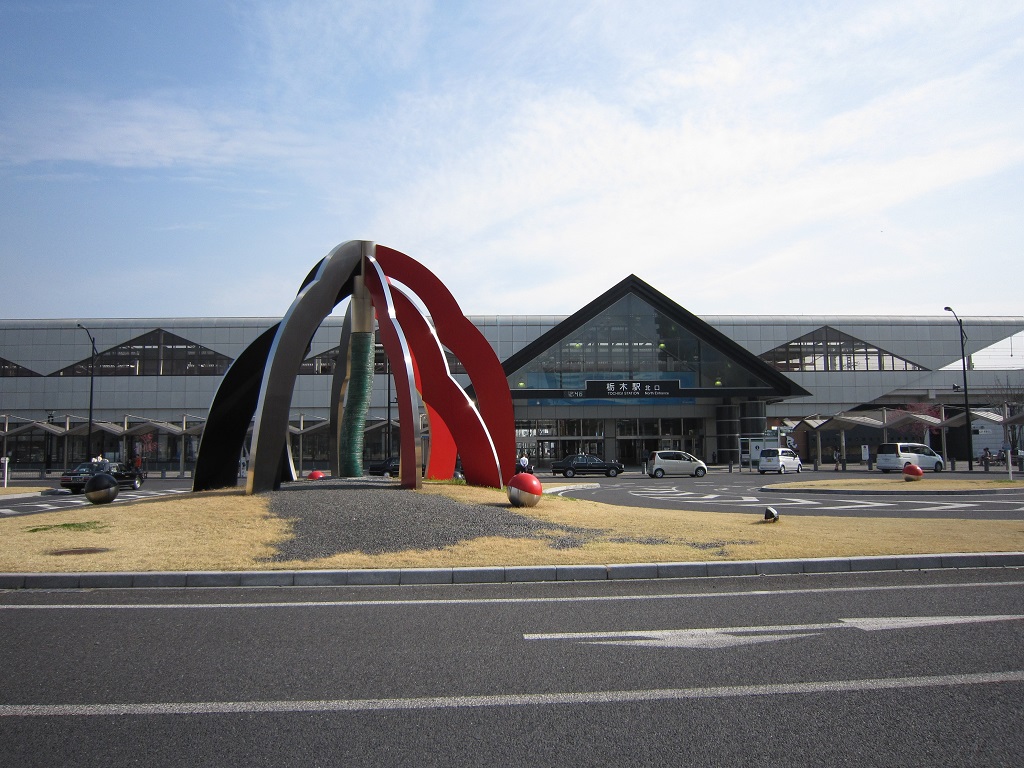 栃木駅は、東武日光線とJR両毛線の駅です。つい最近高架線になりまして、駅舎はかなりきれいです。写真は北口の駅舎で、ここからずーっと歩いていったところに繁華街があります。