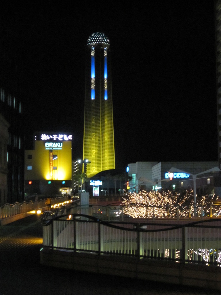 気が付くと、もう真っ暗です。下関駅に戻ってみると、海峡ゆめタワーがきれいでした。夜はこうしてライトアップされるんです。