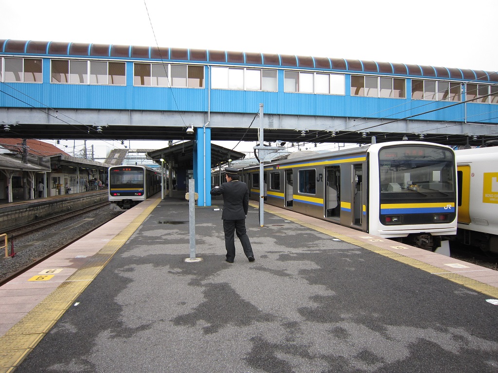 駅構内はかなり広く、さながら車庫があるみたいな感じです。ま、ここへ来る列車って安房鴨川止まりの列車でして、外房線から安房鴨川駅を経由して内房線へ行く(またはその逆)列車ってないんですね。ちなみに、写真は特急わかしおです。安房鴨川駅から外房線・京葉線を経由して、東京駅に行きます。