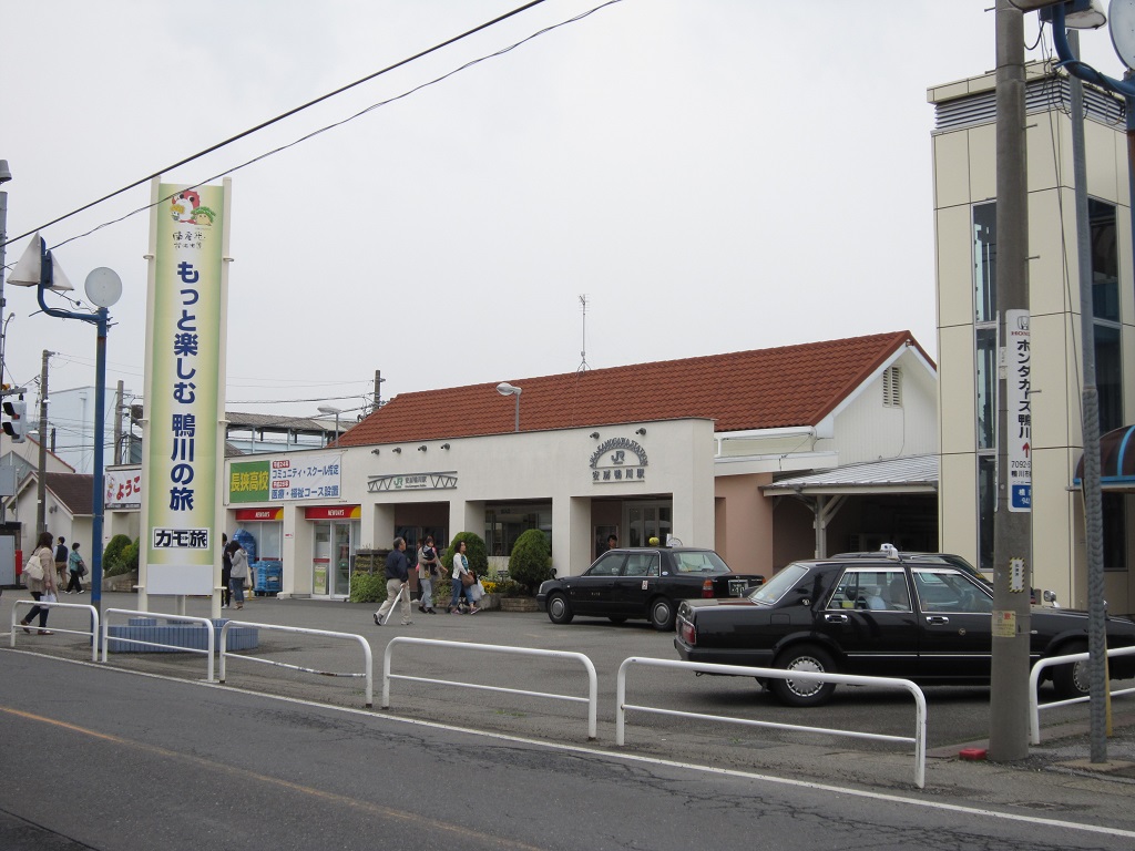 駅前は、鴨川シーワールドやホテル、旅館へ行く送迎バスが発着する、駅前ロータリーになっています。なので、列車(特に、特急わかしお)が到着し改札口を出ると、ホテルの名前を書いた旗や札を持った、送迎バスの運転手さんが出迎えてくれます。