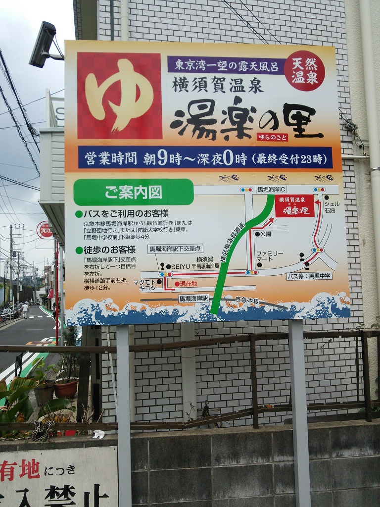 場所は、京急本線の馬堀海岸駅から、歩いて12分・・・だそうですが、もう少し歩く感じです。15分ぐらいは見ておいた方がいいと思います。馬堀海岸駅前には、横須賀温泉 湯楽の里への案内図がありますので、これに従って歩く感じです。ただし、「公園」はすっごくわかりにくいので要注意です。
