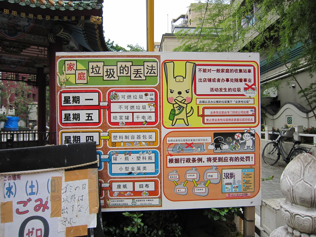 更に、これまた中華街ならではなのが、ごみの収集ルールが中国語で書かれていたりします。残念ながら、キューティー吉本は読めませんけどね。でも、きっと星期 一、星期 五って言うのが、きっと曜日なんでしょうねぇ。
