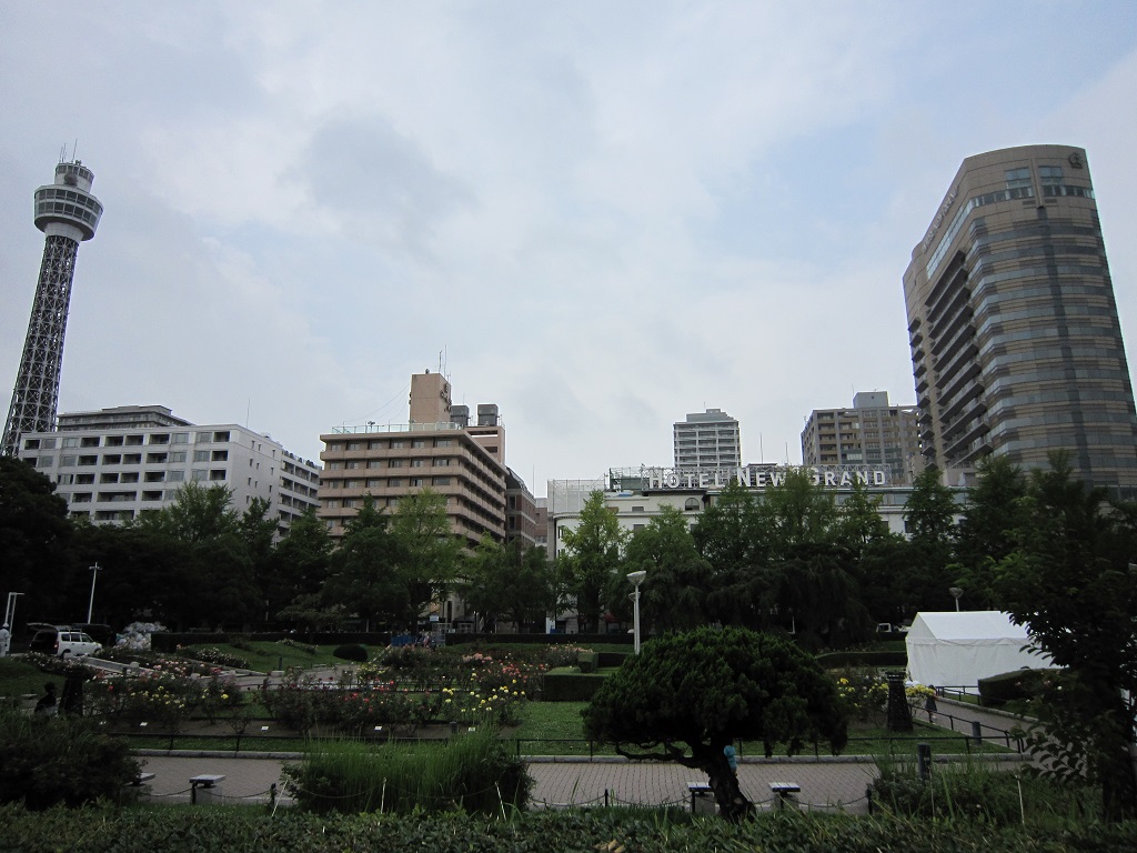 氷川丸のちょうど後ろ、つまり西側がこんな感じ。バラ園になっています。また、横浜マリンタワーとホテルニューグランドがあります。