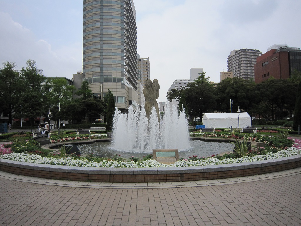 中央広場です。真ん中に噴水がありまして、水の守護神が立っています。この写真の方向にずーっとまっすぐ歩くと、横浜中華街があります。
