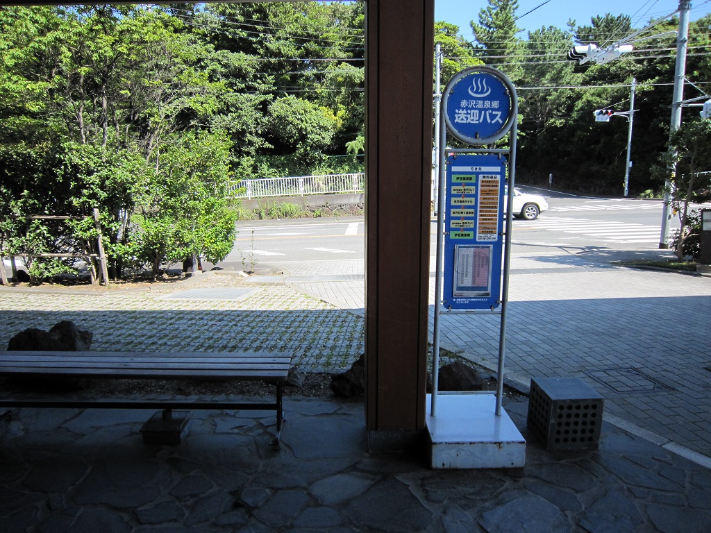 赤沢日帰り温泉館は、高原の湯同様、最寄り駅は伊豆急行線の伊豆高原駅です。伊豆高原駅からは、送迎バスが出ています。休日の昼間は15分間隔、その他の時間帯と平日は30分間隔で運行されているみたいです。一応時刻表がありまして、伊豆高原駅の送迎バス乗り場にも書いてあるのですが、はっきり言ってあてになりません。なぜかと言いますと、休日ともなりますと、赤沢温泉郷-伊豆高原駅間の道路が激しく渋滞するため、時刻表通りに走れないんです。なので、送迎バスに乗る方は、時刻表通りに送迎バスが来なくても焦る必要はありません。気長に待ちましょう。