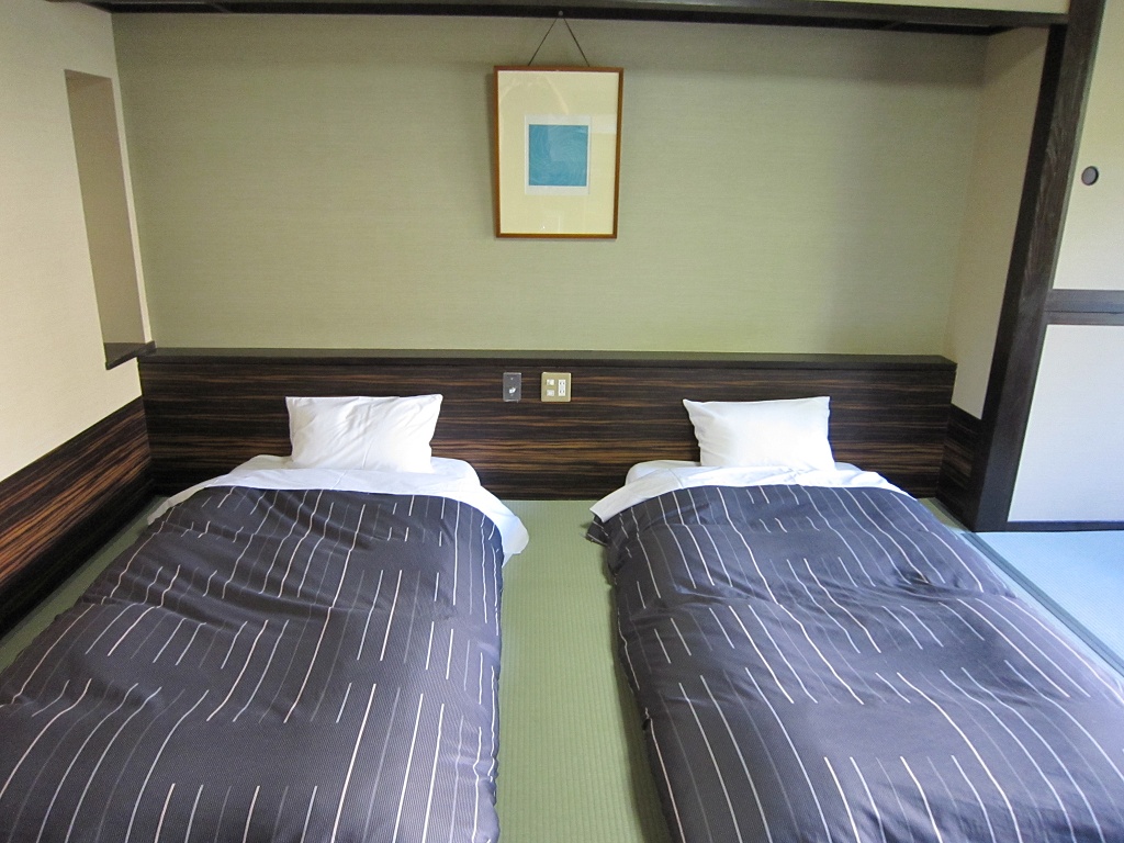 ベッドと言っても、畳の上にマットレスをそのまま置いた感じです。2つあります。気を付けないといけないポイントとして、部屋の中に時計が1つもありません。できればトラベル用の目覚まし時計を持っていくといいでしょう。(逆を言うと、時計ぐらい置いて欲しい)