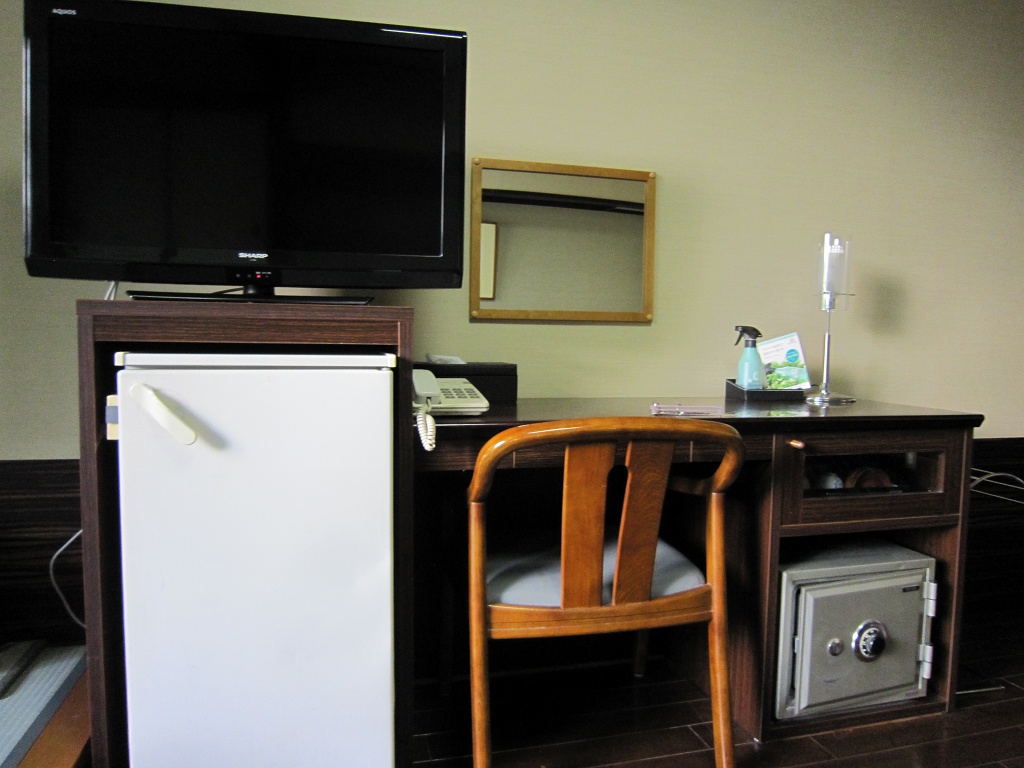 ありがたいことに、座卓とは別に、テーブルと椅子があります。また、テレビも結構デカいです。また、ウィンドウファン型のクーラーがあります。(蔵王温泉に限らず、東北・北海道って、クーラーがない旅館がざらにあったりする)