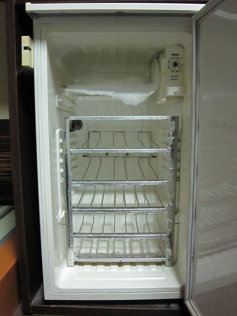 怪しさ爆発なのが、この冷蔵庫。必要以上に大きい上、扉をロックできるようになっているんです。開けてみると、明らかに棚の造りがおかしい。しかも、ドアポケットがない。どうやらこれは昔、飲み物を取り出したら課金される仕組みの冷蔵庫だったみたいです。その関係で、缶か500mlのペットボトルしか入らず、使い勝手はあまりよくありません。
