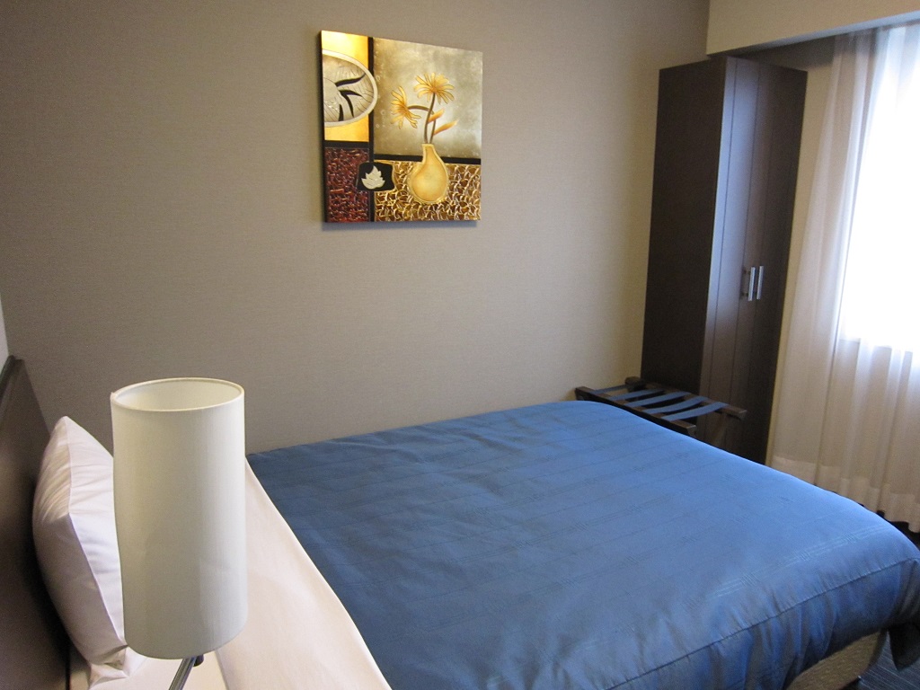 かなり新しいホテルで、中はきれいです。お部屋の広さは、必要にして十分な感じですね。ご覧の通り、ベッドはかなり広いです。シングルの部屋なのですが、セミダブルのベッドを使っているのでしょう。